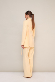 Брючный костюм с шарфом из костюмной ткани. Жакет полуприлегающего силуэта, с центральной застежкой на петли и пуговицы. Воротник пиджачного типа с отложными лацканами, край борта скругленный по низу жакета. Спереди обработаны прорезные карманы в рамку с клапанами и нагрудный прорезной карман с листочкой. Рукава втачные, двухшовные с вытачными шлицами, на левом рукаве декоративная нашивка. Спинка со средним швом и рельефами. Жакет на подкладке. Брюки прямого силуэта с заутюженными стрелками и с боковыми наклонными карманами. Пояс притачной с застежкой на пуговицу и молнию.