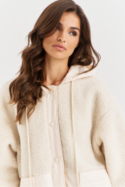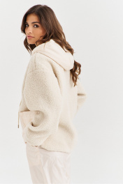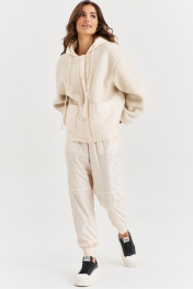 Костюм, состоящий из бомбера и брюк. Бомбер свободного кроя, длиной чуть ниже линии бедер по переду, по спинке удлинен. Перед отрезной ниже линии талии. На нижней части настрочен накладной карман. Застёжка на кнопки на отрезных планках. Линия плеча спущена, рукава одношовные, втачные, длинные. По низу рукава вставлена резинка. По горловине капюшон, в который вставлен декоративный шнур. Бомбер на подкладке. Брюки на подкладке, длиной до щиколотки. На передних половинах шов выше колена. В боковых обработаны карманы с наклонным входом. По низу брюк притачная манжета с резинкой. Брюки по талии на притачном поясе с резинкой.