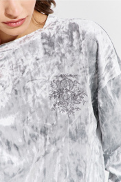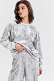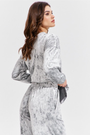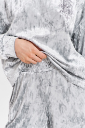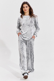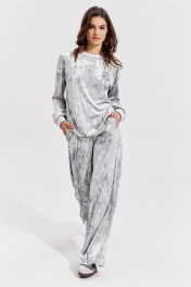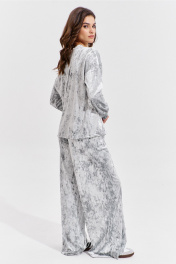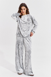 Костюм, состоящий из джемпера и брюк. Джемпер свободного кроя, со спущенной линией плеча, с длинным рукавом. Горловина округлой формы, обработана притачной планкой. По низу рукава притачная манжета. Ширина низа регулируется резинкой. По переду выполнена авторская вышивка. Брюки палаццо на притачном поясе с резинкой. В боковых обработаны карманы с наклонным входом.