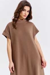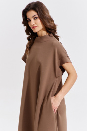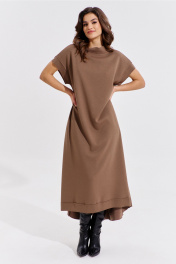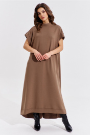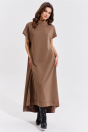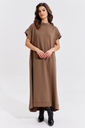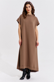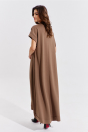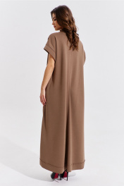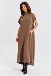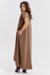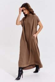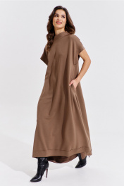 Платье свободного кроя, расширенное к низу, длиной до щиколотки, с неровной линией низа (по переду укороченное). Рукава цельнокроеные, короткие с притачной манжетой. В боковых швах обработаны карманы. Горловина округлой формы со стойкой.