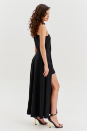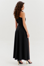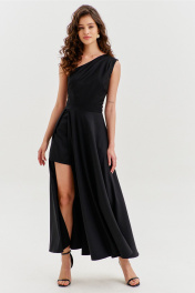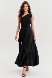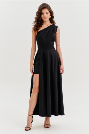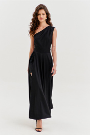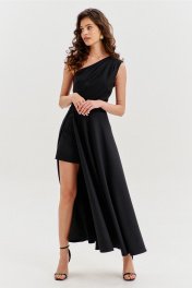 Платье полуприлегающего силуэта, длиной макси. Платье отрезное по лини талии с притачным поясом. Лиф выполнен на одно плечо, по спинке с талиевыми вытачками, по переду с нагрудными вытачками и односторонними складками от плеча. Юбка платья силуэта полусолнце. По спинке со средним швом, по переду с высоким разрезом. Платье дополнено шортами, притачанными к поясу. Шорты длиной выше середины бедра. В правом боковом шве обработана застежка на потайную тесьму-«молнию».