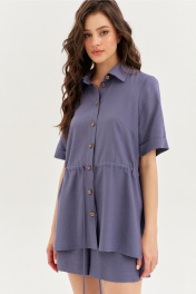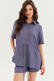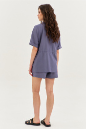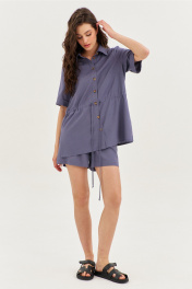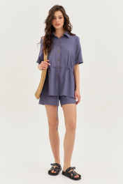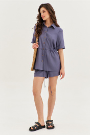 Комплект, состоящий из блузки и шорт. Блузка свободного кроя, длиной чуть ниже линии бедер. Выше линии талии настрочена кулиса и втянут шнур из основной ткани. Перед с нагрудными вытачками. В боковых швах обработаны разрезы. Рукава одношовные, втачные, длиной выше локтя, по низу с цельнокроеной манжетой. Воротник рубашечного типа с отрезной стойкой. Застежка на петли и пуговицы на цельнокроеной планке. Шорты свободного кроя, длиной выше середины бедра. Шорты на притачном поясе с частично вставленной резинкой. По задним половинкам талиевые вытачки. По передним половинкам обработаны боковые карманы с наклонным входом. В среднем шве имитация гульфика.
