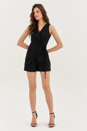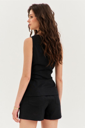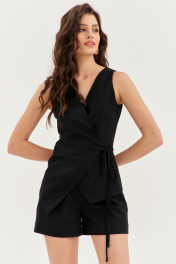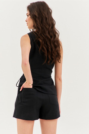 Комплект, состоящий из жилетки и шорт. Жилетка полуприлегающего силуэта, длиной до линии бедер. Спинка со средним швом и рельефами. Перед выполнен на запах, с ассиметричной линией низа. По переду рельефы от пройм до низа. Жилетка двойная из основной ткани. Застежкой служат завязки на уровне талии. Шорты свободного кроя, короткие. По задним половинам талиевые вытачки и настрочены накладные карманы. По передним половинкам заложены мягкие складки и обработаны боковые карманы с наклонным входом, и застежка на тесьму-«молнию» с гульфиком и откоском. Шорты на притачном поясе с резинкой по спинке. По поясу застежка на петлю и пуговицу.
