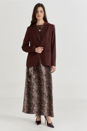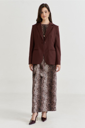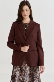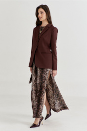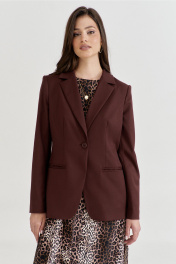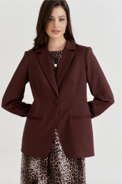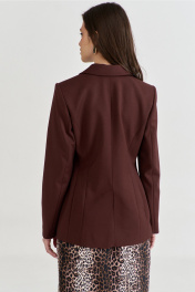 Жакет полуприлегающего силуэта, длиной ниже линии бедер. Спинка со средним швом, в котором обработана шлица, с рельефами от пройм до низа. Перед с нагрудной вытачкой, рельефом и прорезным карманом «в рамку». Рукава двушовные, втачные, длинные. Воротник пиджачного типа с лацканом. Застежка на петлю и пуговицу. Жакет на подкладке.
