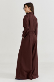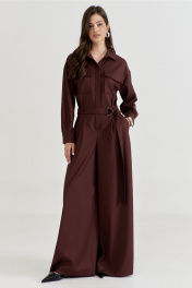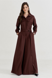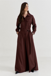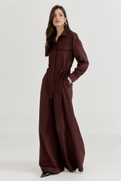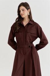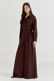 Комбинезон женский, полуприлегающего силуэта, с притачным поясом по талии. Лиф спинки с талиевыми складками, лиф переда со складками от пояса, с настроченными накладными карманами и клапаном. По лифу потайная застежка с притачной планкой. Брюки широкие с мягкими складками по талии, в боковых обработаны карманы. Линия плеча спущена, рукава длинные, по низу со складками, разрезом и притачной манжетой. По горловине воротник рубашечного типа на стойке. По талии втянут съемный пояс с полукольцами.
