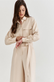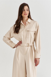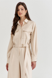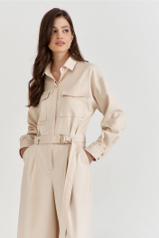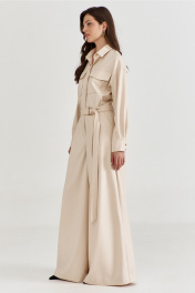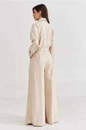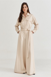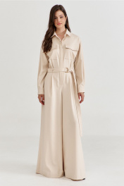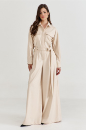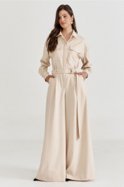 Комбинезон женский, полуприлегающего силуэта, с притачным поясом по талии. Лиф спинки с талиевыми складками, лиф переда со складками от пояса, с настроченными накладными карманами и клапаном. По лифу потайная застежка с притачной планкой. Брюки широкие с мягкими складками по талии, в боковых обработаны карманы. Линия плеча спущена, рукава длинные, по низу со складками, разрезом и притачной манжетой. По горловине воротник рубашечного типа на стойке. По талии втянут съемный пояс с полукольцами.