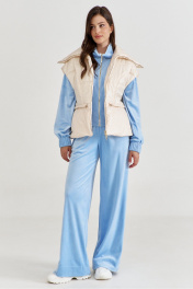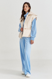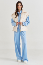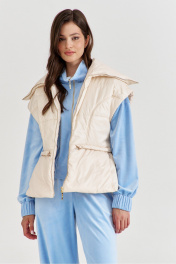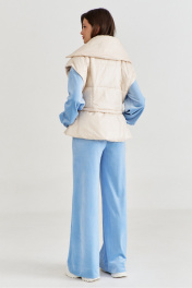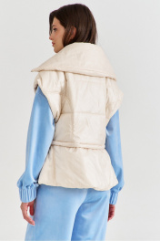 Жилетка полуприлегающего силуэта, длиной чуть выше линии бедер. Жилетка отрезная по линии талии. Лиф спинки и переда с рельефами от пройм до талии. Баска с фигурными подрезами, по переду обработаны карманы. По талии вставлена кулиса, в которую протянута резинка с фиксаторами. По горловине объемная стойка. Линия плеча спущена. по переду застёжка на декоративную тесьму-«молнию». Жилетка на подкладке и утеплена синтепоном.