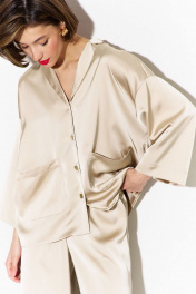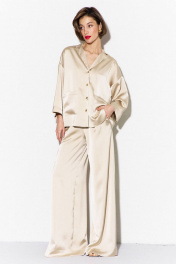Комплект (блузка и брюки): -блуза свободного кроя со спущенной линией плеча -по переду настрочены накладные карманы -рукава одношовные, втачные, длиной 3/4 -воротник пиджачного типа -брюки палаццо на притачном поясе с резинкой -в боковых швах карманы.