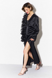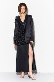 Жакет свободного кроя: -спинка с талиевыми вытачками -правый перед декорирован рюшами из отделочной ткани -горловина V-образной формы, без воротника -рукава двушовные, втачные, длинные -жакет на подкладке и с плечевыми накладками.