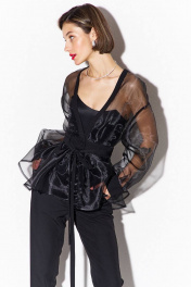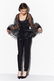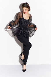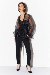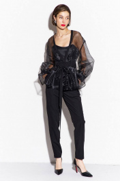 Комплект (блузка и брюки): - блузка полуприлегающего силуэта, длиной до линии бедер. -блузка с притачным поясом по талии из отделочной ткани -линия плеча спущена, рукава одношовные, втачные, длинные -по поясу притачаны шлевки и вставлен пояс -брюки полуприлегающего силуэта, длиной до щиколотки -по переду выполнена застежка на тесьму-«молнию» -на притачном поясе, по спинке которого вставлена резинка.