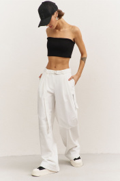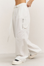 Брюки свободного кроя: • притачной пояс • складки от пояса • в боковых швах карманы • отрезные в области колена • накладные карманы с декоративной молнией и патами • по спинке кокетка и прорезные карманы-обманки с листочкой • застежка на тесьму-«молнию» с гульфиком • съемный пояс с полукольцами