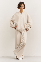 Комплект (бомбера+брюки). Бомбер свободного кроя: • спущенная линия плеча • по горловине стойка • застежка на молнию • карманы с клапанами и застежкой на кнопку • рукава втачные, длинные с притачной манжетой • по низу притачная планка Брюки свободного кроя: • притачной пояс на резинке • по переду декоративный застроченный кант • в боковых швах карманы