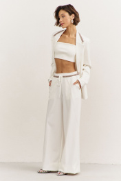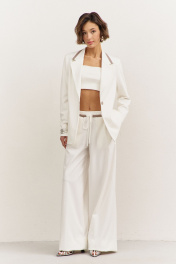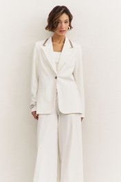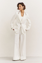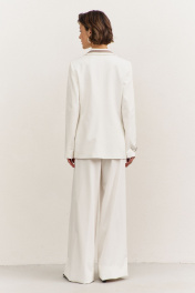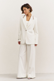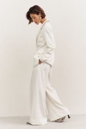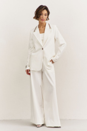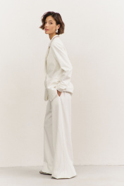 Костюм (жакет+брюки). Жакет полуприлегающего силуэта: • воротник пиджачного типа с лацканами, с декоративным элементом из отделочной ткани • застежка на пуговицу • прорезные карманы с рамкой • рукава втачные, длинные • на подкладке Брюки свободного кроя: • притачной пояс на резинке • по поясу кулиса из отделочной ткани и декоративный шнур • в боковых швах карманы