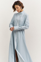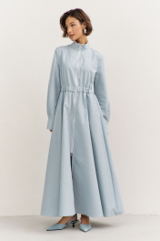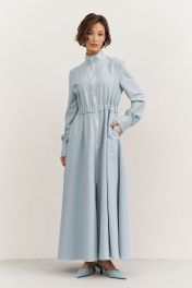 Платье полуприлегающего силуэта: • воротник-стойка • по переду кокетка • отрезное по линии талии • по талии кулиса с резинкой • юбка А-образного силуэта • застежка на молнию • в боковых швах карманы • рукава втачные, длинные с притачной манжетой • манжеты с застежкой на кнопки • длина макси