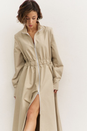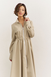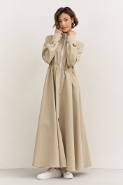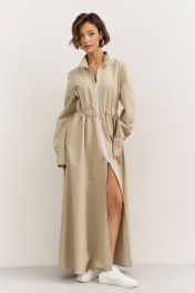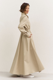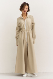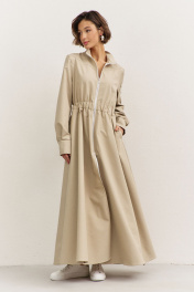 Платье полуприлегающего силуэта: • воротник-стойка • по переду кокетка • отрезное по линии талии • по талии кулиса с резинкой • юбка А-образного силуэта • застежка на молнию • в боковых швах карманы • рукава втачные, длинные с притачной манжетой • манжеты с застежкой на кнопки • длина макси