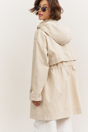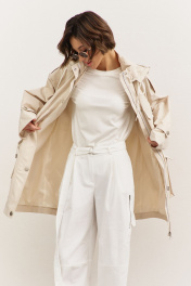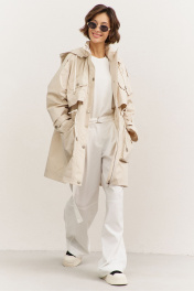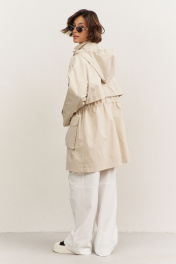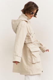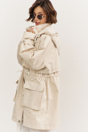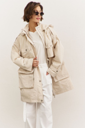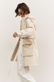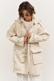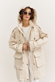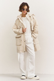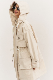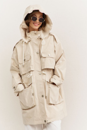 Куртка свободного кроя: • спущенная линия плеча • воротник-стойка • перед и спинка с отлетной кокеткой • рукава втачные, длинные • по переду на кокетке клапаны • по талии кулиса со шнуром • накладные карманы-«портфели» с клапанами • на плечах и рукавах декоративные паты с застежкой на кнопки • застежка на молнию, которая прикрыта пластроном с кнопками • на подкладке • съемный капюшон на кнопках
