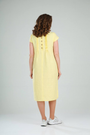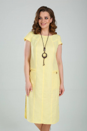 Платье прямого силуэта с рельефами по переду. На бочках переда карман врамку с петлей пуговицей. Рукав-крылышко. Спинка с втачной планкой на петли-пуговицы и декоративными защипами. Платье дополняет подвеска ручной работы