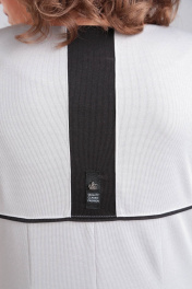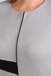 Платье с нагрудными выточками , с округлой горловиной. Спинка с заниженной кокеткой, в шов вставлен кант отделочный, спинка с декоративной вставкой по вертикали, с центральным швом и разрезом, с боковыми выточками. По полочке в центральном швеи декаративный кант на всю длину изделия. По линии талии и линии бёдер горизонтальные декоративные элементы в виде полос. Одношовный втачной рукав 3/4