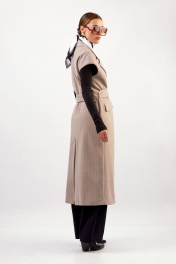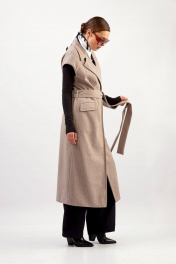 Жилет: - прямой силуэт - шлица сзади - на подкладке - широкий пиджачный воротник - боковые карманы с клапаном - застежка на пришивные кнопки - пояс из основной ткани в комплекте