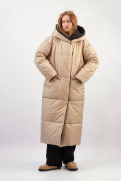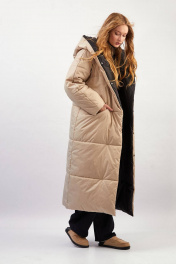 Пальто двухстороннее с капюшоном - прямой силуэт - застёжка на два ряда потайных кнопок - передние карманы в горизонтальном шве - рукава-реглан, двухшовные, зауженные к низу - стёганые перед, спинка, рукава и капюшон - утеплитель 300 г/м² - температурный режим до –30 °C