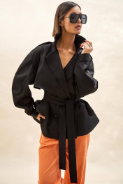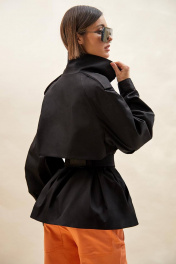 Тренч укороченный из джинса: - расширенный силуэт; - двубортная застёжка на кнопки; - наклонные карманы с листочкой; - воротник пиджачного типа; - отлетная кокетка по спинке и переду; - рукав-реглан, двухшовный, со складками по локтевому шву, с прямыми манжетами с застёжкой на кнопку; - двойная пата по плечу; - широкая шлевка с кожаной этикеткой и тиснением; - съёмный пояс из основной ткани; - на подкладке.
