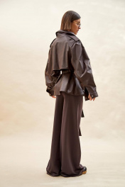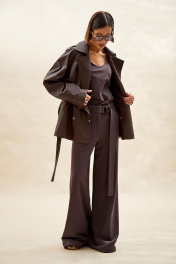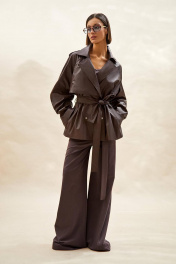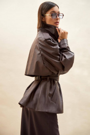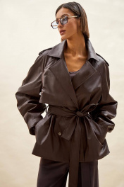 Тренч укороченный из экокожи: - расширенный силуэт; - двубортная застёжка на кнопки; - наклонные карманы с листочкой; - воротник пиджачного типа; - отлетная кокетка по спинке и переду; - рукав-реглан, двухшовный, со складками по локтевому шву, с прямыми манжетами с застёжкой на кнопку; - двойная пата по плечу; - широкая шлевка с кожаной этикеткой и тиснением; - съёмный пояс из основной ткани; - на подкладке.