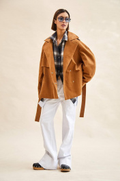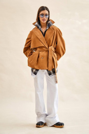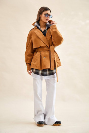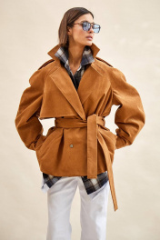 Тренч укороченный из вельвета: - расширенный силуэт; - двубортная застёжка на кнопки; - наклонные карманы с листочкой; - воротник пиджачного типа; - отлетная кокетка по спинке и переду; - рукав-реглан, двухшовный, со складками по локтевому шву, с прямыми манжетами с застёжкой на кнопку; - двойная пата по плечу; - широкая шлевка с кожаной этикеткой и тиснением; - съёмный пояс из основной ткани; - на подкладке.