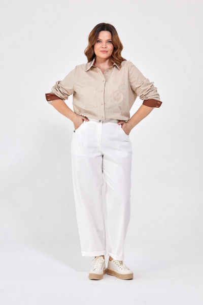 Блуза: - полуприталенный силуэт - отрезная по переду и спинке - рубашечный воротник - застежка на пуговицы - рукав втачной с манжетой - фигурный низ - нижняя сторона манжет, планок и стойки воротника тёмно-синего цвета - накладные карманы - вышитая аппликация спереди на левом кармане и на спинке