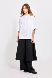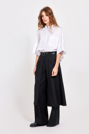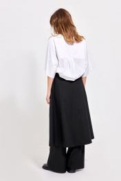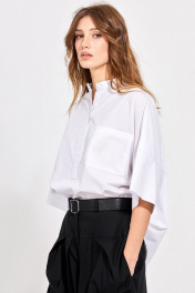 Блуза: - свободный силуэт - воротник-стойка - застежка до линии талии на пуговицы по планке - по переду накладной карман - рукав цельнокроеный с широкой притачной манжетой - на спинке кокетка со складкой - в боковых швах небольшие разрезы - асимметричный низ с удлинённой спинкой.