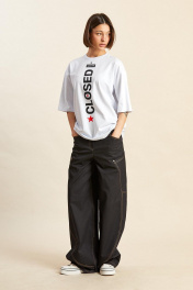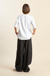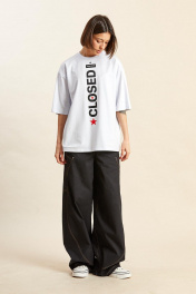 Футболка: - свободный крой oversize; - спущенная линия плеча; - горловина обработана планкой из основной ткани; - футболка дополнена авторским принтом спереди.