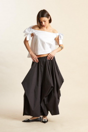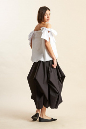 Топ: - из рубашечной ткани; - силуэт прямой; - перед и спинка одинаковые; - с открытым декольте, вырез горловины горизантальный, бретели спущены; - на обеих бретелях распложены банты.