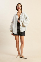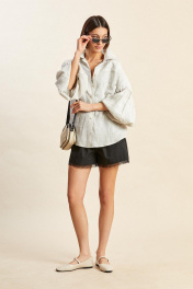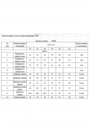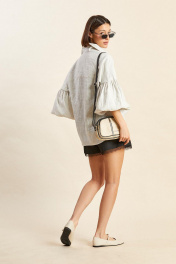 Блуза: - о-силуэт; - линия плеча спущена; - застёжка спереди на пуговицы; - на спинке и спереди двухслойная кокетка; - рукава широкие, со сборкой от проймы, книзу заужаются и собираются на 5 рядов строчек с эластичной нитью, оставляя по низу расклешенные манжеты; - воротник рубашечный; - спереди с обеих сторон накладные прямоугольные карманы.