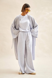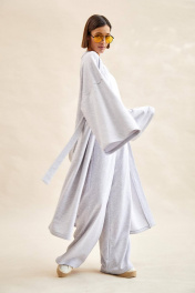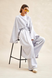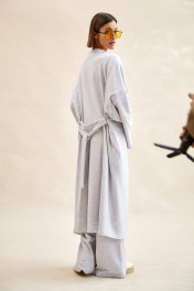 Кардиган: - ткань - футер трехнитка; - свободный силуэт; - спущенная линия плеча; - рукава широкие прямые; - в боковых швах карманы и шлевки для сьемного пояса; - борта и горловина обработаны притачными планками.
