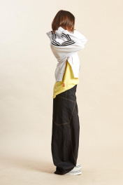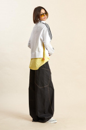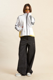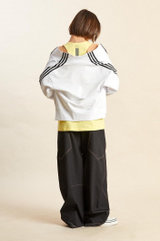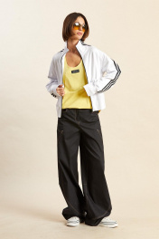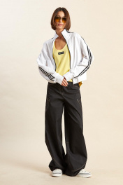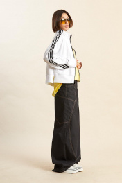 Джемпер: - ткань – футер двухнитка; - прямой силуэт; - линия плеча спущенная; - застёжка спереди на молнию; - спереди прорезные карманы с тонкими листочками; - по бокам высокие разрезы; - манжеты рукавов, низа, а также воротник сделаны из отделочного материала (рибана); - вдоль рукавов, линии плеча и через воротник проходят широкие лампасы с печатными полосками.