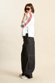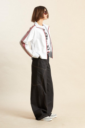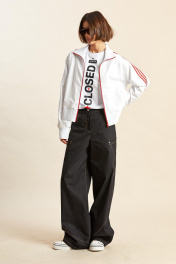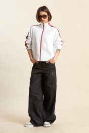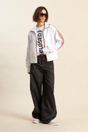 Джемпер: - ткань – футер двухнитка; - прямой силуэт; - линия плеча спущенная; - застёжка спереди на молнию; - спереди прорезные карманы с тонкими листочками; - по бокам высокие разрезы; - манжеты рукавов, низа, а также воротник сделаны из отделочного материала (рибана); - вдоль рукавов, линии плеча и через воротник проходят широкие лампасы с печатными полосками.