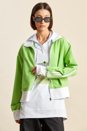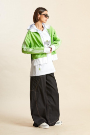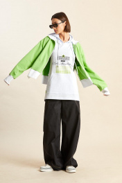 Джемпер: - ткань – футер двухнитка; - прямой силуэт; - линия плеча спущенная; - застёжка спереди на молнию; - спереди прорезные карманы с тонкими листочками; - по бокам высокие разрезы; - манжеты рукавов, низа, а также воротник сделаны из отделочного материала (рибана); - вдоль рукавов, линии плеча и через воротник проходят широкие лампасы с печатными полосками.