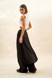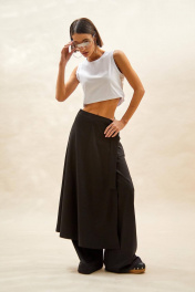 Брюки с накидкой: - прямой силуэт; - застежка сбоку на потайную молнию; - боковые карманы. Накидка съёмная: - расширенный силуэт; - пояс с застёжкой сбоку на полукольца; - в боковом шве карман.
