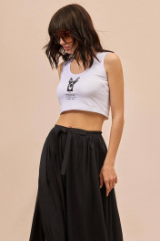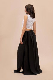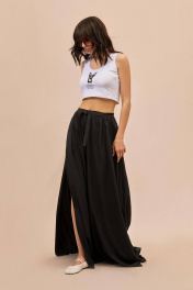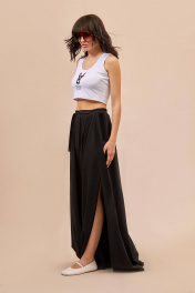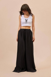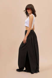 Брюки: - расширенный силуэт большого объема - пояс спереди с прямой вставкой и двумя завязками; сбоку и сзади — на эластичной резинке - сборка по всей талии - без боковых швов, с каждой стороны - широкий запах