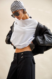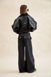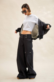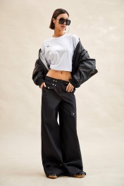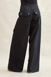 Брюки из джинса: - широкие, расширены от бедра; - посадка низкая; - широкий пояс-кокетка с двумя рядами шлевок и патами на кнопках спереди; - спереди и сзади кокетки; - в боковых швах карманы; - спереди декоративные клапаны с кнопками; - сзади карманы с клапанами и кнопками; - спереди на колене накладной карман с клапаном на кнопках; - застежка спереди на молнию и три потайных кнопки на поясе; - спереди по низу паты со шлевками и кнопками.