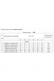 Брюки: - ткань – футер двухнитка; - силуэт прямой; - в боковых швах карманы; - застежка спереди на молнию и кнопку на поясе; - на притачном поясе пять шлевок; - в комплекте съемный пояс из основного материала с застежкой на пряжку-полукольца.