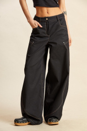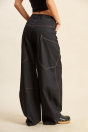 Брюки из тонкого джинса: - О- силуэт; - пояс притачной со шлёвками и застёжкой на кнопку; - спереди застёжка на молнию; - в боковых швах спереди карманы угольной формы; - спереди рельефные швы округлой формы; - сзади кокетка и большие накладные карманы, заходящие на перед; - на участке под коленями горизонтальные вытачки; - все отделочные швы с одинарной и двойной отстрочкой.