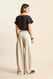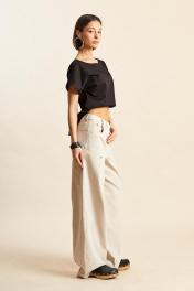 Брюки из тонкого джинса: - О- силуэт; - пояс притачной со шлёвками и застёжкой на кнопку; - спереди застёжка на молнию; - в боковых швах спереди карманы угольной формы; - спереди рельефные швы округлой формы; - сзади кокетка и большие накладные карманы, заходящие на перед; - на участке под коленями горизонтальные вытачки; - все отделочные швы с одинарной и двойной отстрочкой.
