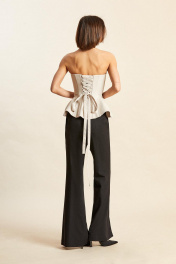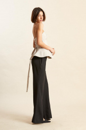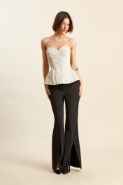 Брюки-клёш: - полуприлегающий силуэт; - клёш от колена; - по переду разрезы; - в боковых швах карманы; - верх с поясом и шлёвками; - застёжка на молнию и петлю с пуговицей на поясе.