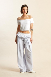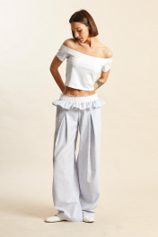 Брюки: - свободный силуэт; - в боковых швах карманы; - спереди от талии по центру встречные складки, скрепленные сверху; - пояс на резинке, из кружева на подкладке из отделочной ткани; - вдоль шва по талии оборка.
