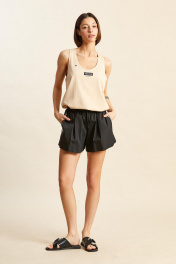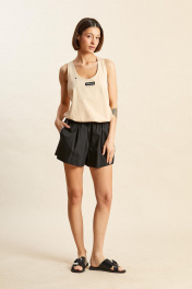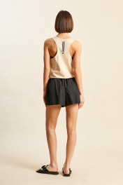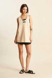 Майка-боксёрка: - силуэт трапеция; - линия плеча укорочена; - спинка по ширине заужена; - горловина круглая, расширена и углублена; - спереди и сзади печати.