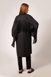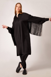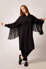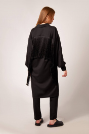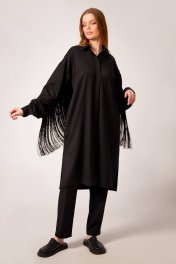 Платье-рубашка: - прямой силуэт - воротник стояче-отложеной - застёжка на потайную планку с пуговицами - спущенная линия плеча - рукав двухшовный с монжетой - карманы в боковых швах - по спинке кокетка - по рукавам и спинке вставлена бахрома длиной 30 см Брюки: - прилегающий силуэт - боковые карманы - застежка-молния и пуговица