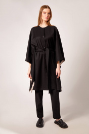 Платье-туника: - свободный силуэт - без рукавов - без боковых швов - съёмный пояс продевается через отверстия спереди и сзади, - застежка на планку и черные матовые кнопки - все края внутри обработаны тонкими обтачками контрастного цвета - без карманов Брюки: - прилегающий силуэт - боковые карманы - застежка-молния и пуговица