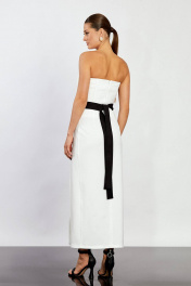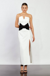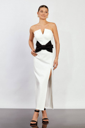 Платье: - прилегающий силуэт - отрезное по линии талии - верх на корсетных косточках - сверху по центру v-образный вырез - в рельефном шве спереди разрез - застёжка сзади на потайную молнию - съемный пояс с бантом