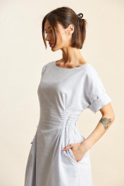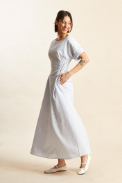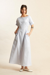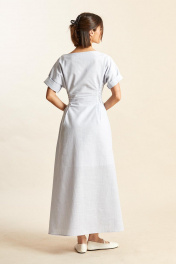 Платье: -х- силуэт; - длина макси; - на х/б подкладке; - широкий вырез горловины, как углубленная лодочка; - линия плеча спущенная; - рукава прямые, короткие; - в боковых швах карманы; - спереди и сзади на талии рельефы, в каждый вставлено по 8 петель, через которые по бокам сделана эластичная шнуровка.