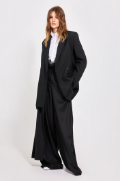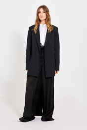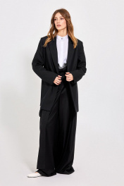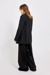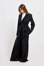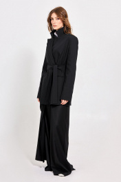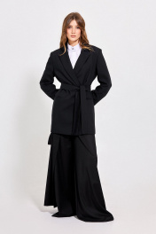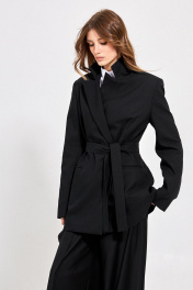 Жакет: - полуприталенный силуэт - пиджачный воротник - спинка со средним швом - карманы без клапанов - застежка на потайные кнопки - без шлёвок, пояс в комплекте - удлинённый, низ прямой